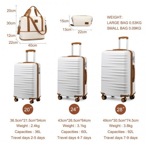 This suitcase features four silent 360 swivel TPE wheels for easy maneuvering, a retractable telescopic handle with multiple height settings, a secure 3-dial TSA combination lock, a puncture-resistant zip,both the 24 inch and 28 inch have two normal handles - one on the top and one on the side,and four plastic feet on the side to rest the bag on , and a well-organized main compartment with nylon straps, a buckle, a zippered section, and a mesh zip pocket for efficient packing.