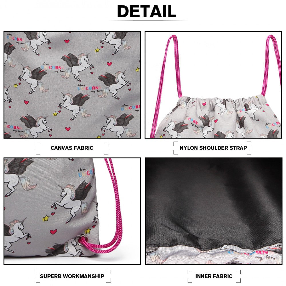 Miss Lulu Unicorn Print Drawstring Backpack - Grey