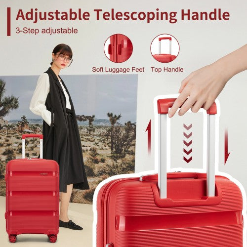 The adjustable telescopic handle includes multiple height settings, and there are top and side carry handles for versatile lifting options. Additionally, four stabilizing feet on the side keep your suitcase upright when placed sideways.