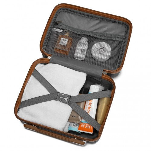 The vanity case is engineered for seamless utility and elegance, featuring YKK zippers for smooth access, elasticated straps and mesh zip pockets for organized packing. It includes soft touch handles, wear-resistant foot pads for protection, and a fixed belt structure to attach to your trolley case, ensuring a hassle-free journey.