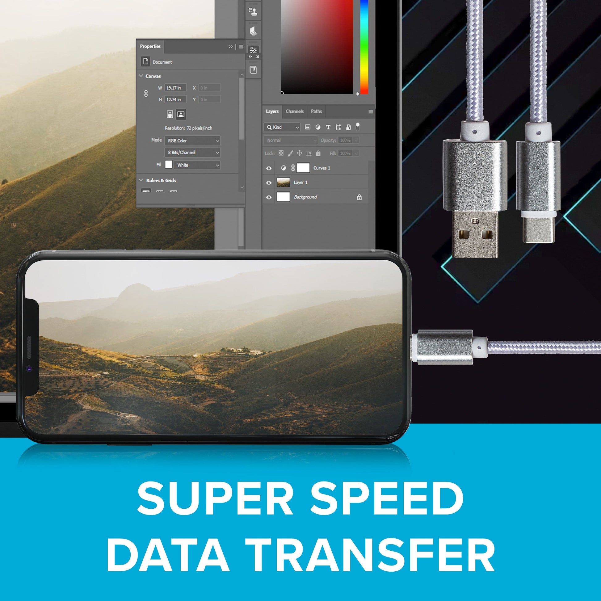 Maplin USB-C to USB-A Braided Cable - Silver, 3m