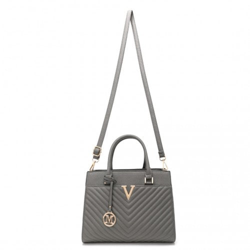 This sophisticated ladies' tote bag is a harmonious blend of functionality and style, with a standout chevron quilting pattern complemented by a bold V-shaped metallic emblem on the front.