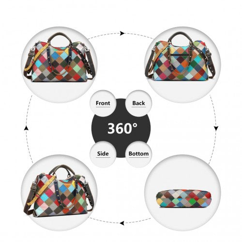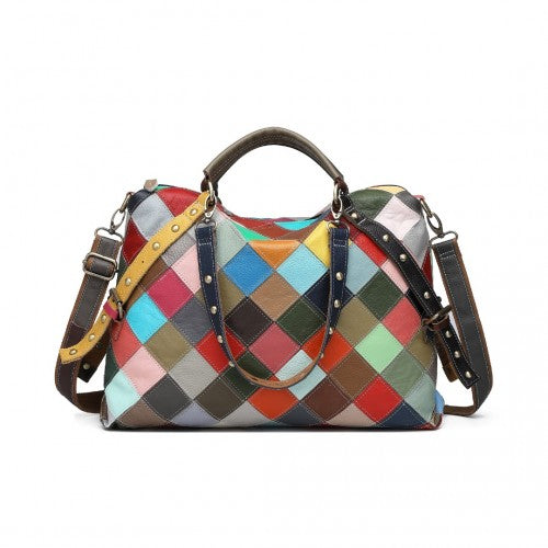 The bag's distinctive appeal lies in its artistic construction, composed of leather panels that come together seamlessly. The juxtaposition of vibrant hues in both warm and cool tones creates a visually captivating and unique patchwork effect.